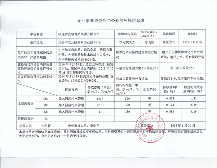 福建省麥爾食品集團(tuán)有限公司環(huán)境信息公示