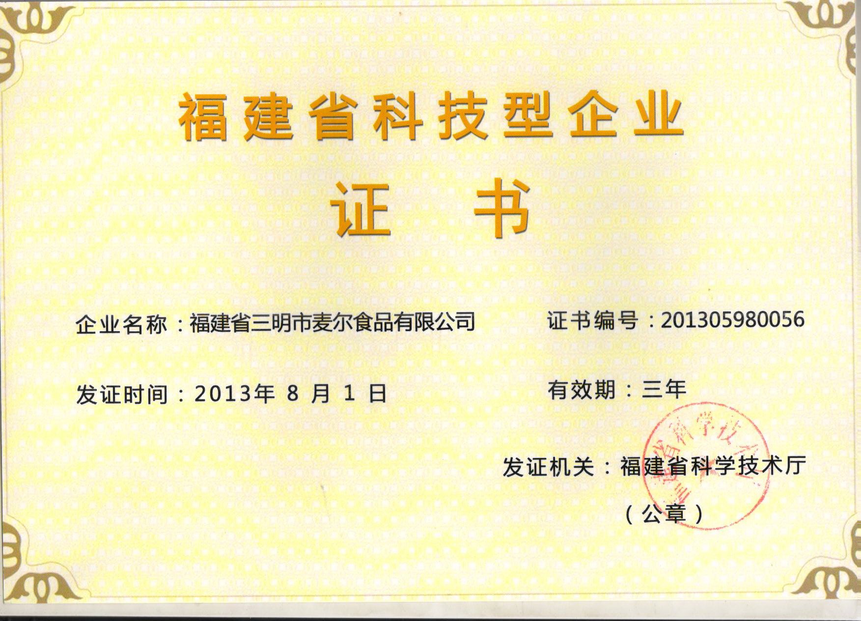2014年1月9日,我司被福建省科學(xué)技術(shù)廳授予“福建省科技型企業(yè)”稱號(hào)。